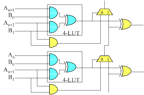 The Xilinx Virtex device includes an extra gate in the carry chain logic that allows a 4 input LUT plus the carry chain to perform a 2xN partial product, thereby achieving twice the density otherwise attainable. In this case, the adder (consisting of the XOR gates and muxes in the carry chain) adds a pair of 1xN partial products obtained with AND gates. The extra AND gate in the carry logic allows you to put AND gates on both inputs of the adder while maintaining a 4 input function.